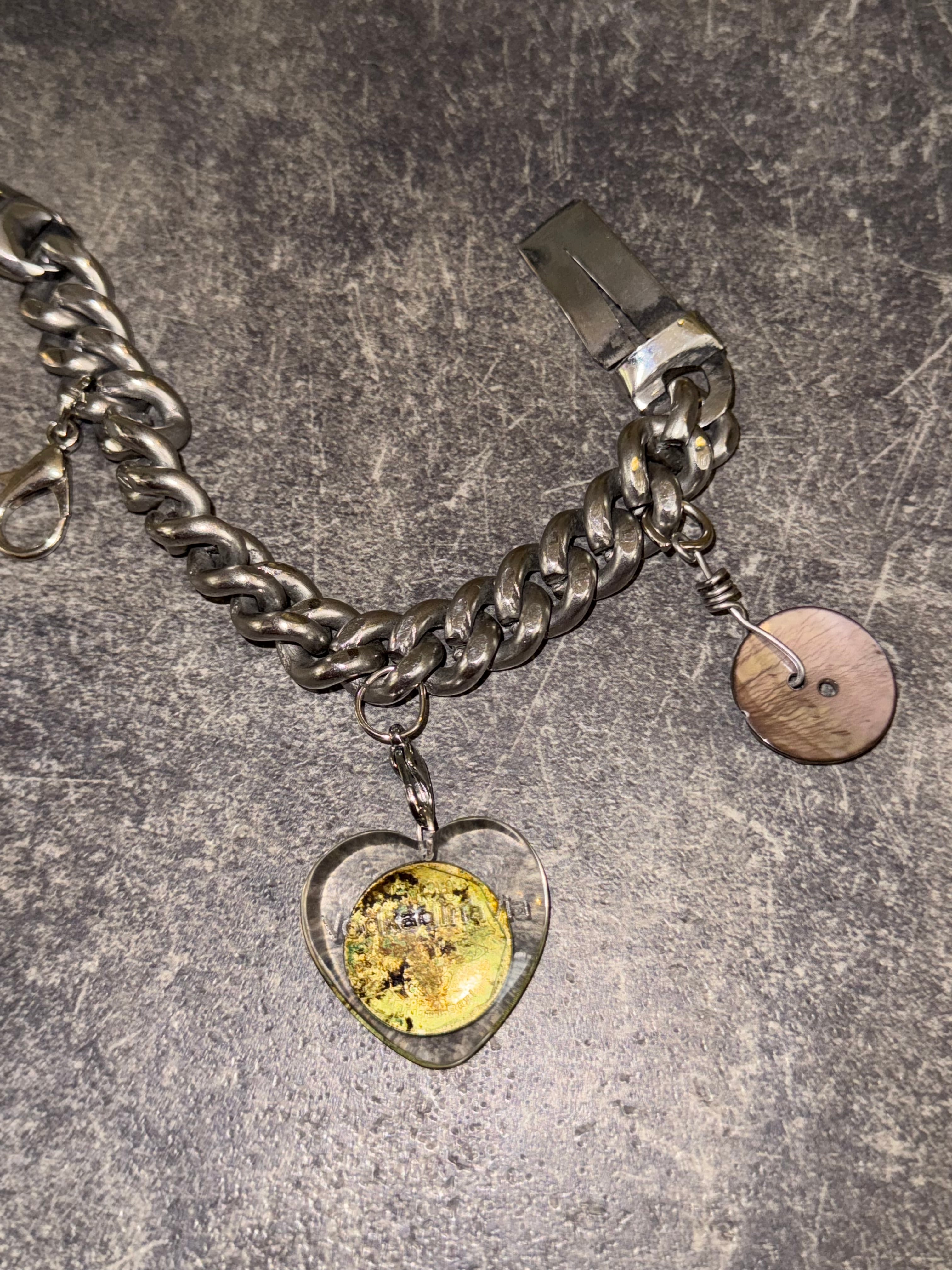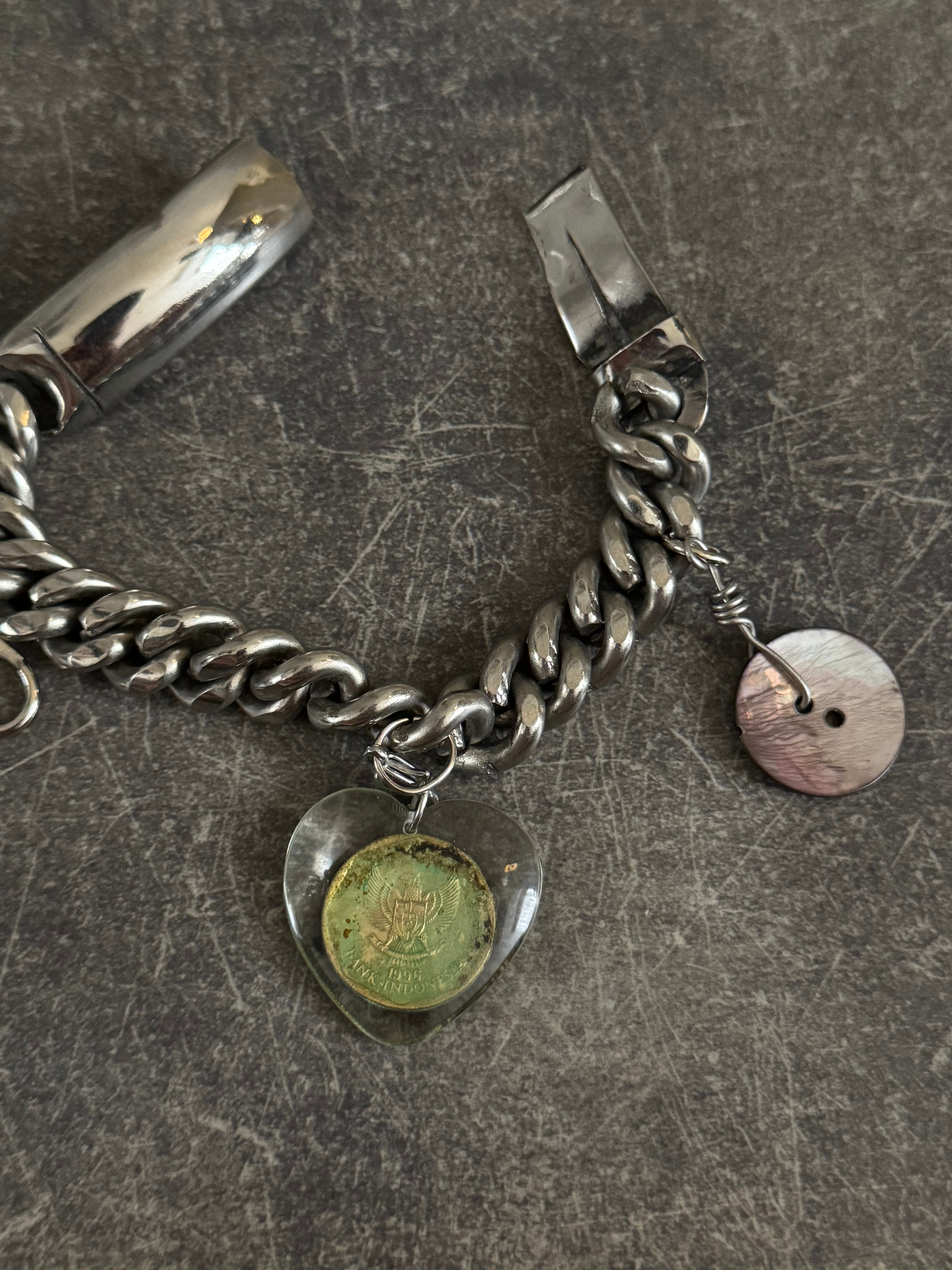 The bracelet is carefully handcrafted one by one by local artisans in a small workshop in Central Java, Indonesia. The material is a handmade stainless steel chain.