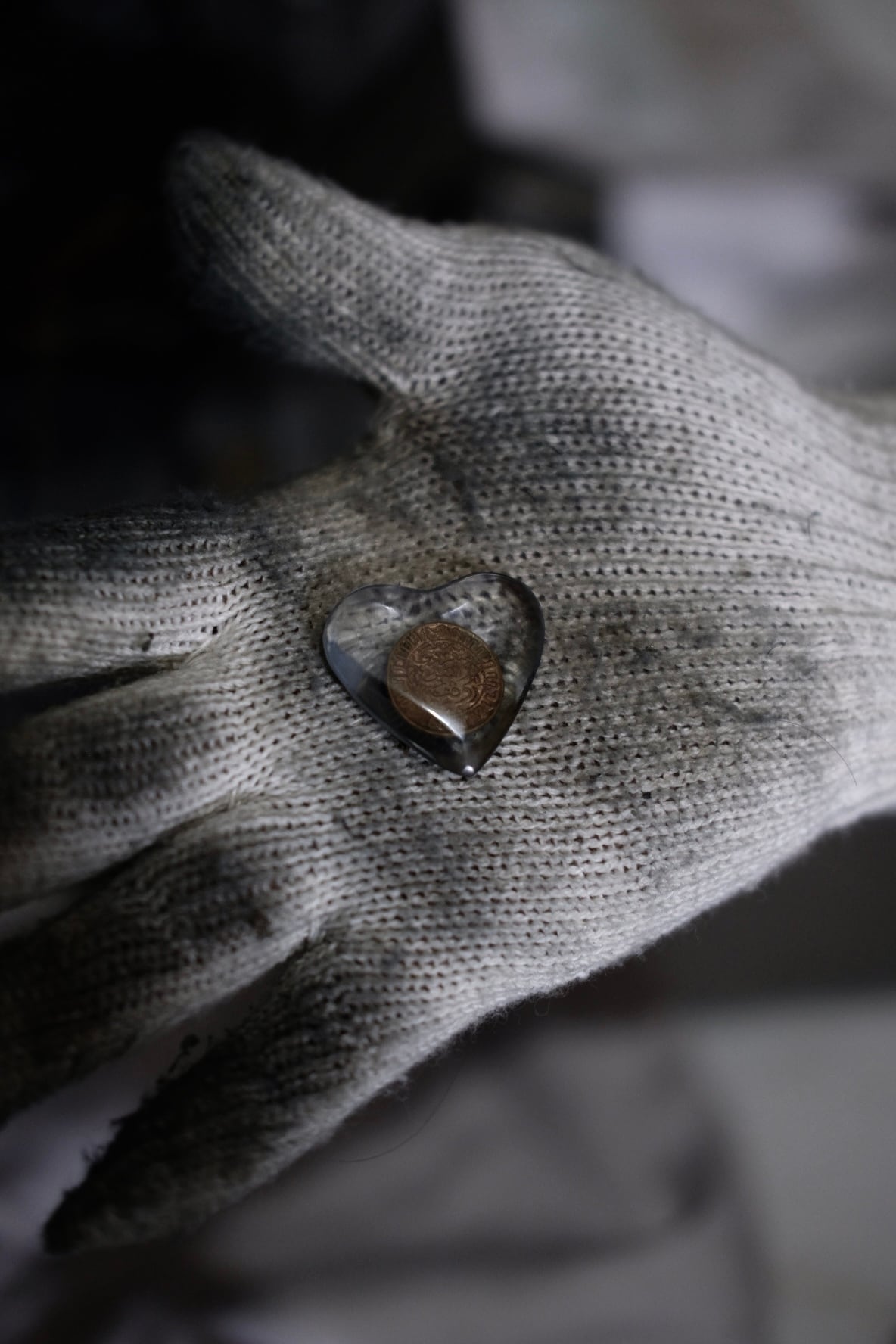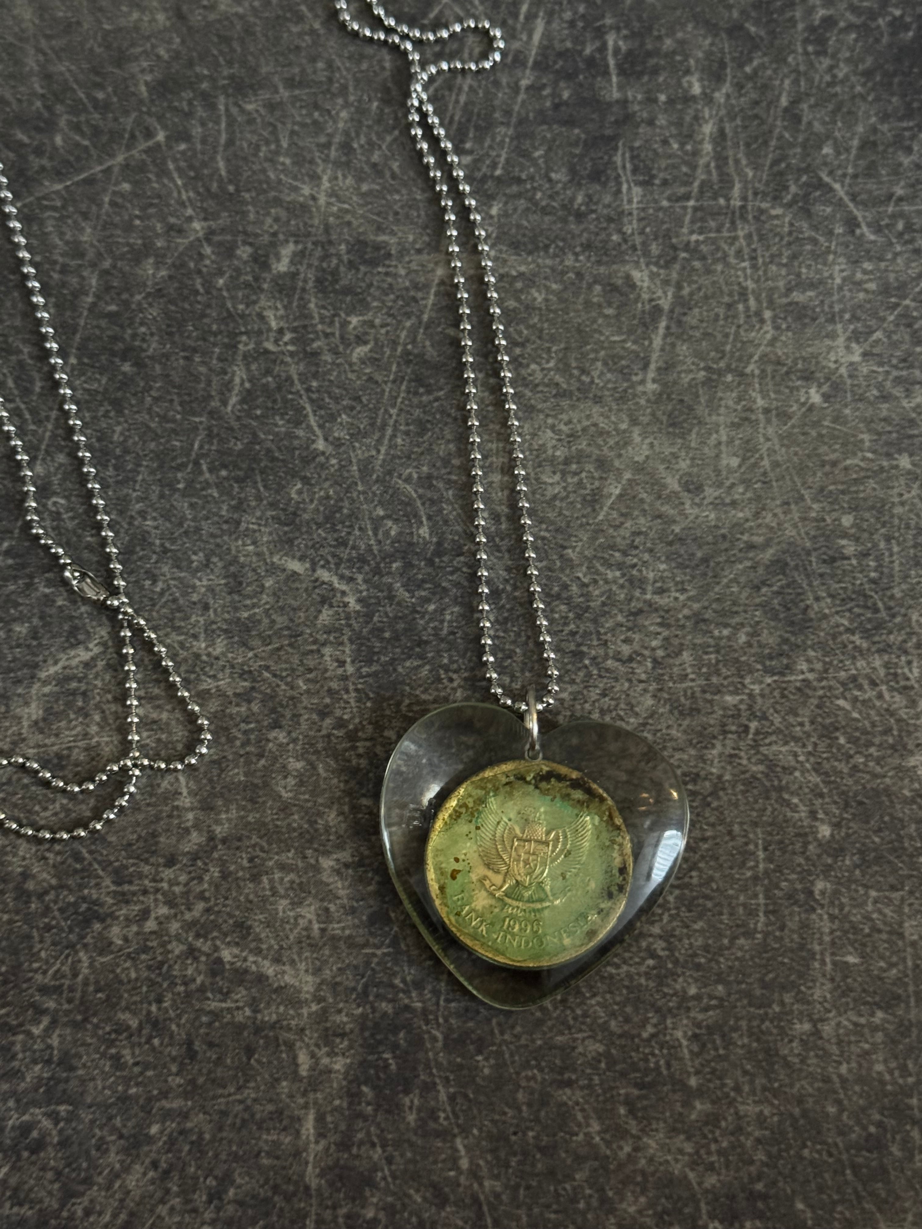 The antique coins are authentic Indonesian coins that were once in circulation between the 1700s and the 1990s. They carry the memory of a land that endured Dutch colonial rule, Japanese occupation, and the struggle for independence. Each coin is encased in transparent resin and transformed into the shape of a heart—a symbol that embraces past pain and division, while holding a wish for Love and Peace.