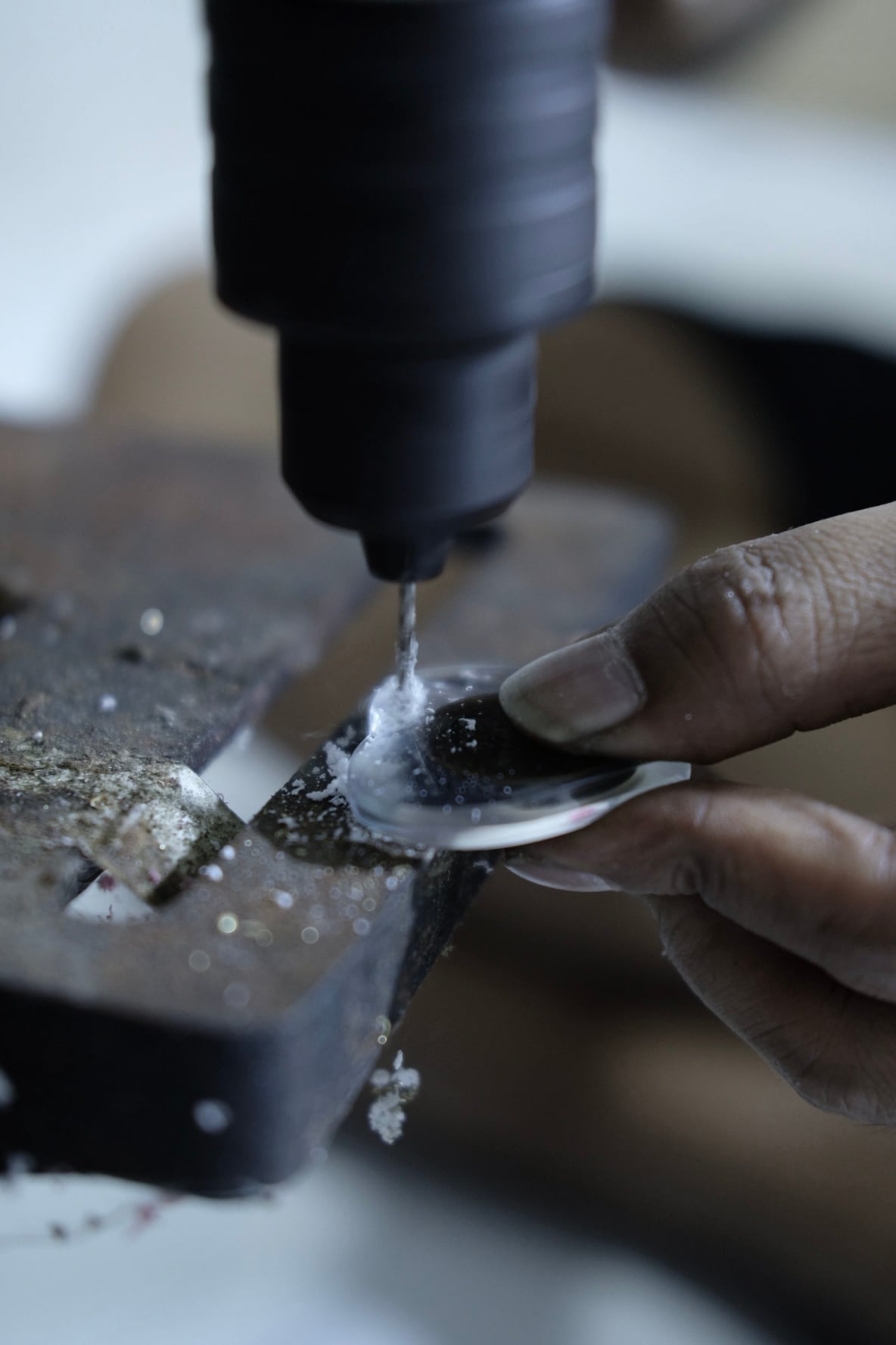 Gelang ini dibuat dengan penuh ketelitian, satu per satu, oleh para pengrajin lokal di sebuah bengkel kecil di Jawa Tengah, Indonesia. Bahannya adalah rantai stainless steel buatan tangan.