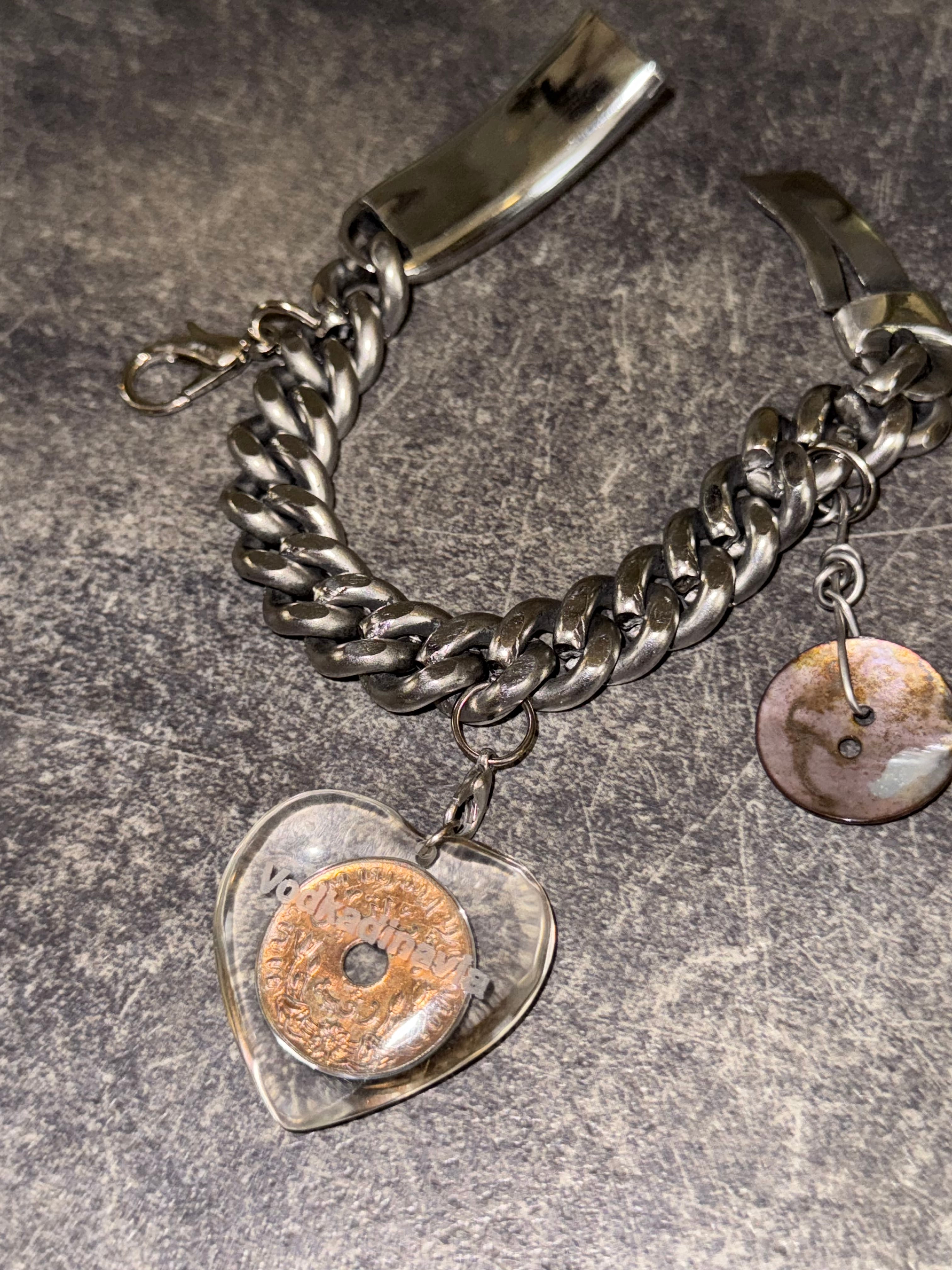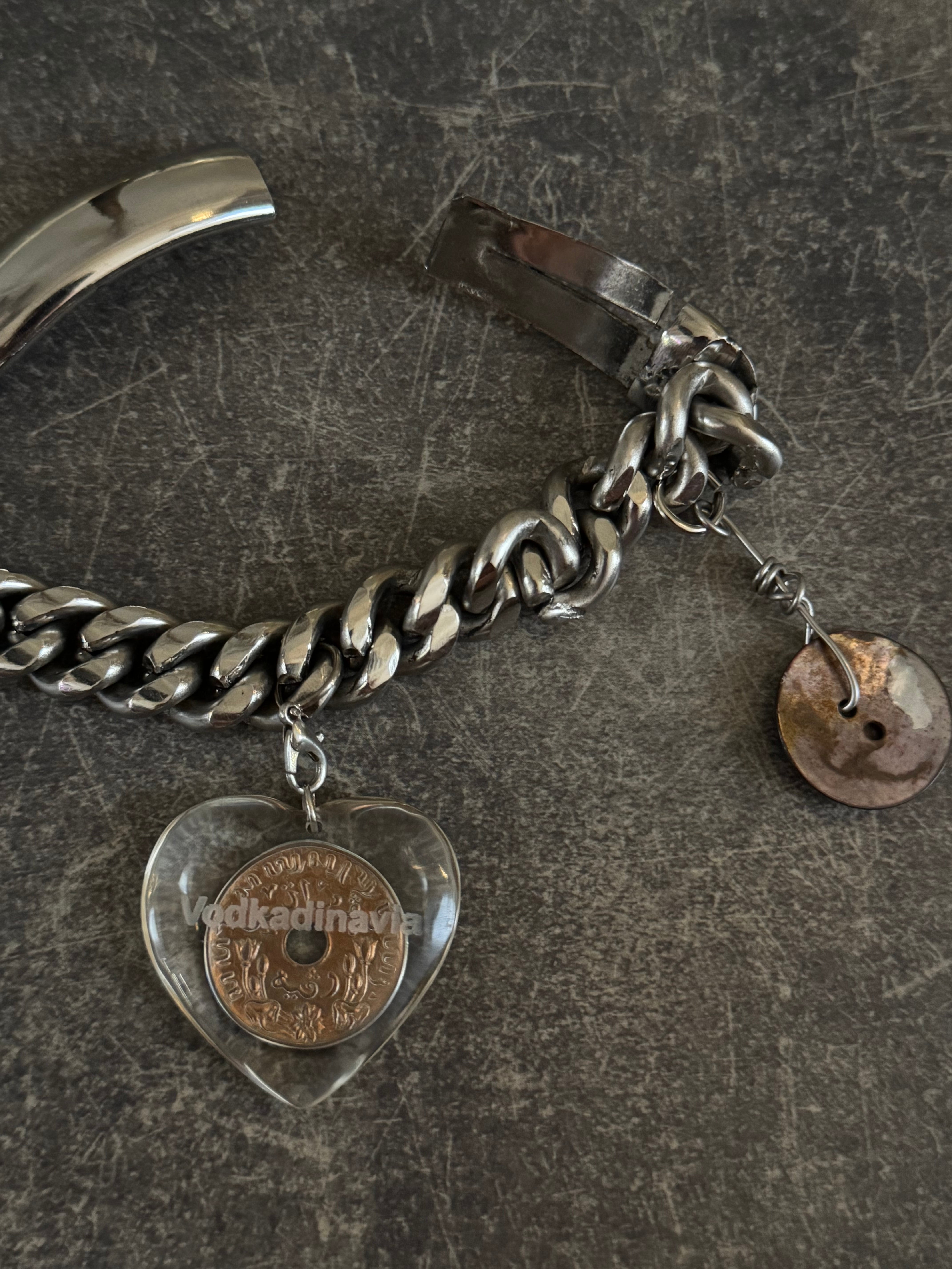 The bracelet is carefully handcrafted one by one by local artisans in a small workshop in Central Java, Indonesia. The material is a handmade stainless steel chain.
